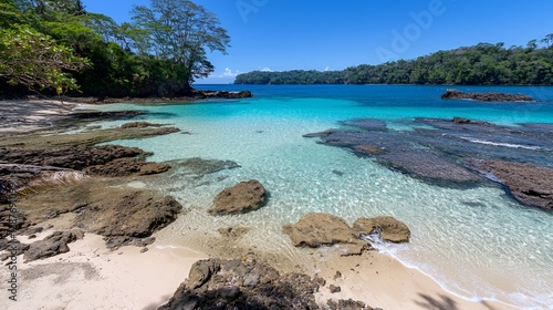 © Supardi, Obraz premium Tropical Beach Scene with Clear Turquoise Water and Rocky Shore