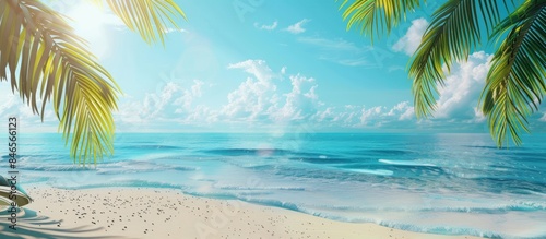 Fototapeta premium Tropical Beach Scene with Palm Leaves, Glowing Sunlight, and Blue Seas - Perfect for Summer Vacations!