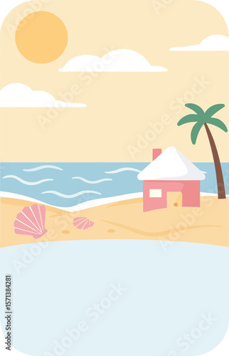 Fototapeta premium Tropical Beach Scene with Palm Tree and Hut under Sunny Sky and Calm Ocean Waves Illustration