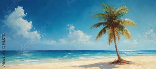 Fototapeta premium Tropical Beach Scene with Palm Tree and Turquoise Ocean under Bright Sunshine