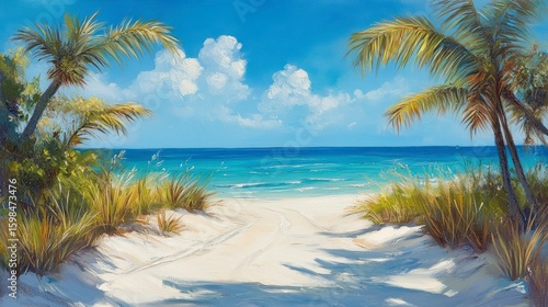 © sablengjago, Fototapeta premium Tropical beach scene with palm trees, white sand, and turquoise ocean.