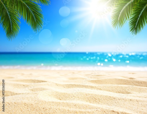 © sae, Fototapeta premium Tropical beach scene with sun and palm leaves