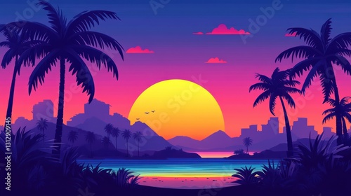 Naklejka premium Tropical Beach Sunset Scene with Palm Trees and City Skyline