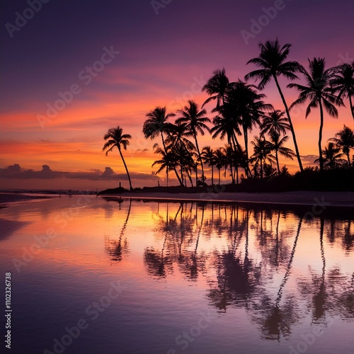 Naklejka premium tropical beach sunset silhouetting a variety of palm trees, gradient sky from...