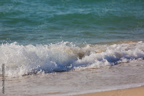 Fototapeta premium Tropical beach white sand, blue clear ocean water. sea foam on the beach on a sunny day. sea waves on the shore. surf breaking on shore at sunset