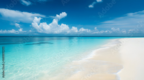 © Martin, Fototapeta premium Tropical Beach with Blue Ocean, Tranquil Sky, and Sandy Shore - Perfect Summer Vacation Destination