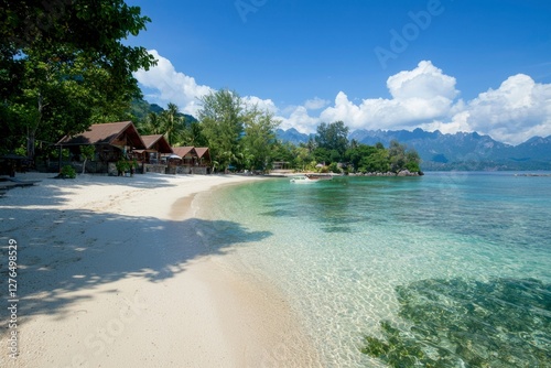 Fototapeta premium Tropical beach with bungalows, clear water, and mountain backdrop