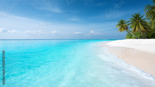 Fototapeta premium Tropical beach with clear turquoise water, white sand, and palm trees under bright blue sky with soft clouds, evoking calm and relaxation