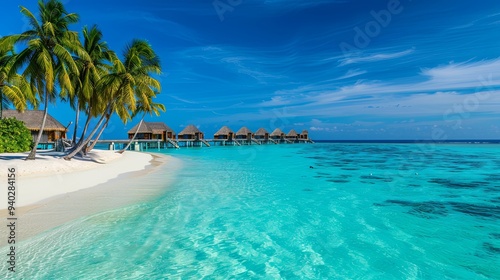 Naklejka premium Tropical beach with clear turquoise water, white sand, palm trees and overwater bungalows.
