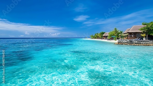 Fototapeta premium Tropical beach with crystal clear turquoise water and thatched roof huts.