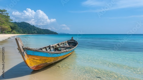 © Generative AI, Fototapeta premium Tropical Beach with Old Fishing Boat and Blue Ocean Under Sunny Sky : Generative AI