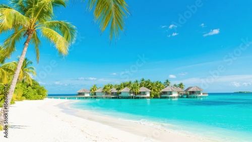 Naklejka premium Tropical Beach with Overwater Bungalows and Palm Trees