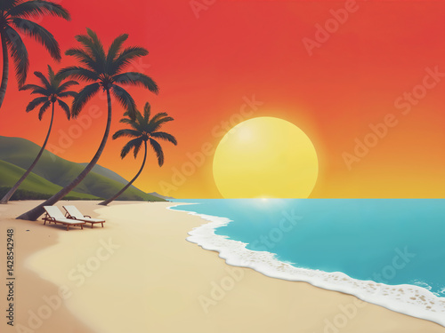 © REDMIXX, Obraz premium tropical beach with palm tree illustration