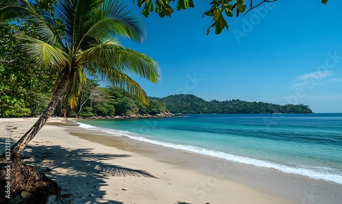 © Kishan, Obraz premium tropical beach with palm trees and blue ocean.