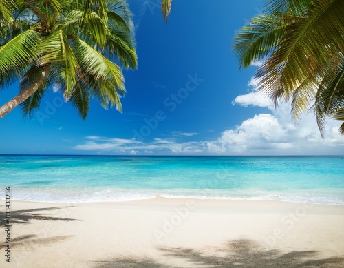 © Raymond, Obraz premium tropical beach with palm trees and blue sky