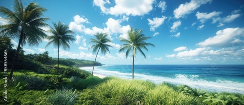 Fototapeta premium Tropical Beach with Palm Trees and Blue Sky