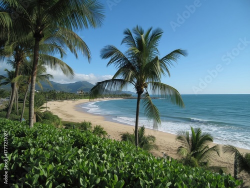 © Oisi, Fototapeta premium Tropical beach with palm trees and turquoise ocean waves