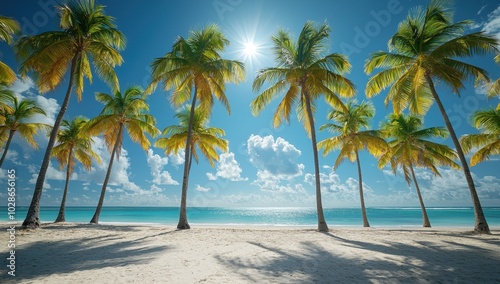 Fototapeta premium Tropical beach with palm trees and turquoise sea. Concept paradise, vacation,...
