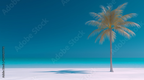 Fototapeta premium Tropical beach with palm trees, ocean, blue sky, summer vacation, travel destination, paradise, leisure, relaxation, nature, blank space for text.