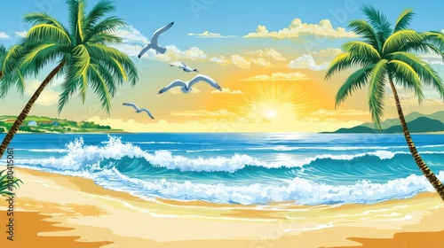 Fototapeta premium Tropical Beach with Palm Trees, Seagulls, and Sunset Waves in Vector Style