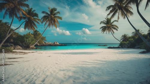 Obraz premium Tropical beach with palm trees, white sand, and turquoise water under a...