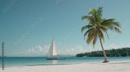 Obraz premium Tropical Beach With Sailboat And Palm Tree