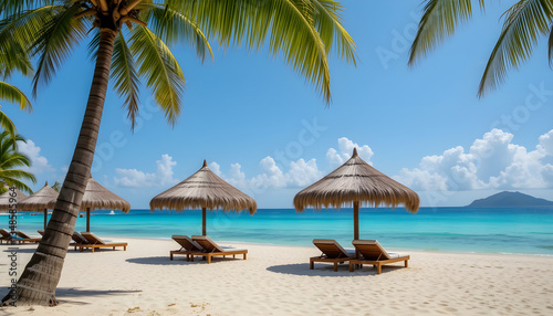 © Murtaza, Obraz premium Tropical beach with thatched umbrellas and lounge chairs by the ocean by Cavan