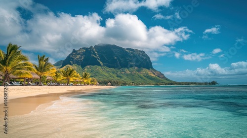 © Irfan, Fototapeta premium Tropical Beach with Turquoise Water and Mountain Backdrop in Paradise