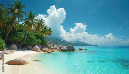 © Pete, Naklejka premium Tropical beach with white sand palm trees turquoise ocean blue sky with fluffy clouds. Scenic seashore landscape, vacation, travel, relaxation, idyll. Perfect holiday destination, paradise, coast,