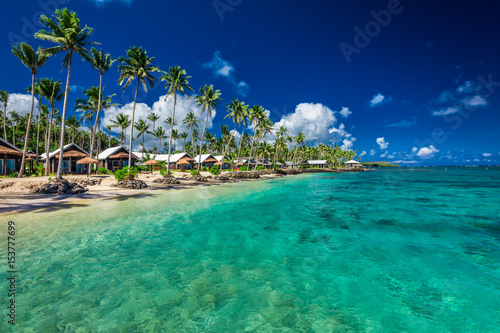 © Martin Valigursky, Fototapeta premium Tropical beach with with coconut palm trees and villas on Samoa