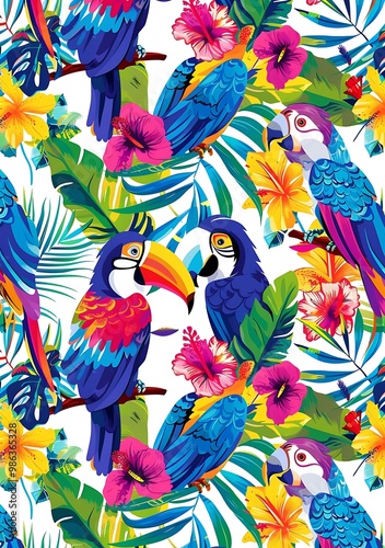 © duyina1990, Fototapeta premium Tropical Bird and Flower Seamless Pattern