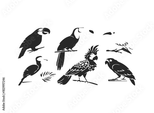 © Ahmed44, Fototapeta premium Tropical bird faces icon set parrot toucan and more