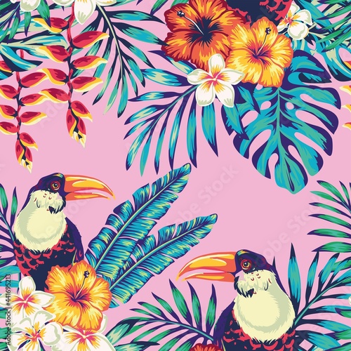 © SamsonFM, Naklejka premium Tropical bird toucan and multicolor parrot on the background of exotic hibiscus flower and palm leaf. Summer floral plant print. Nature animals wallpaper. Seamless vector pattern