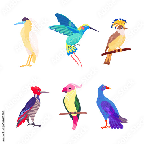 Obraz premium Tropical Bird with Bright Feathers Sitting on Tree Branch Vector Illustration Set