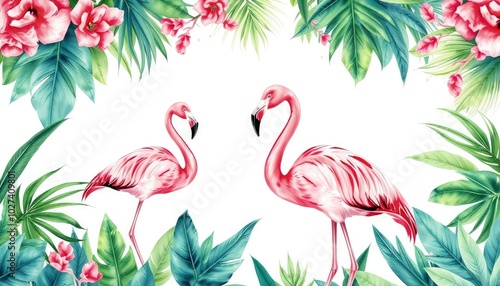 Fototapeta premium Tropical birds: pink flamingo on isolated white background, watercolor...