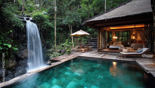 © jambulart, Fototapeta premium Tropical bungalow with pool and waterfall.