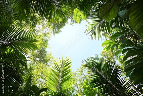 © yuniazizah, Fototapeta premium Tropical Canopy View: Palm Fronds Framing a Bright Sky
