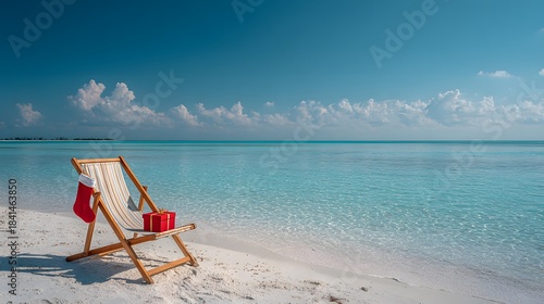 Obraz premium Tropical Christmas concept features a wooden deck chair with a red stocking and gift box on a white sand beach facing the blue sea.