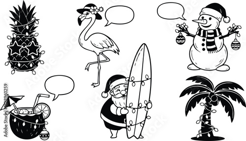 Fototapeta premium Tropical christmas vector art with santa holding surfboard snowman with ornaments flamingo pineapple cocktail palm tree and empty speech bubbles in black outline style