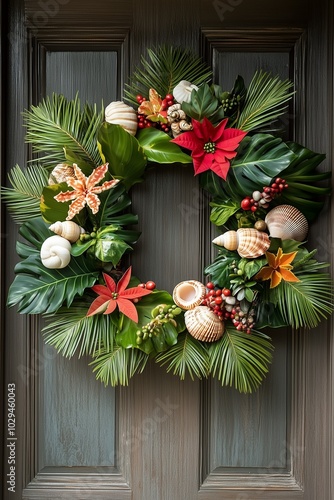 © Veronika, Fototapeta premium Tropical Christmas wreath with palm leaves, shells, starfish and colorful tropical flowers that can be hung on the door or wall to celebrate the New Year