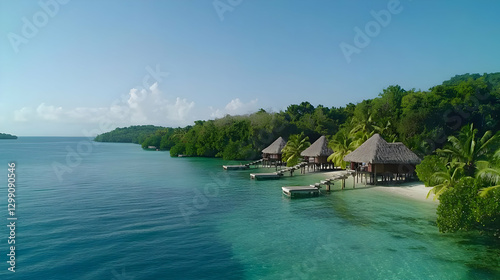Fototapeta premium Tropical Coastal Scene with Bungalows on a Turquoise Ocean Under a Blue Sky