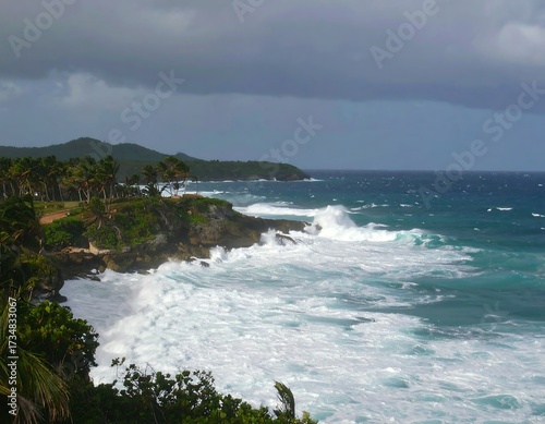 Naklejka premium Tropical coastline under a stormy sky