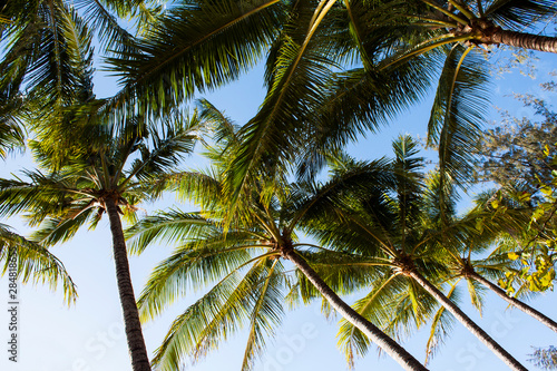 Fototapeta premium Tropical coconut palms on a south sea island signifying a taste pf paradise.