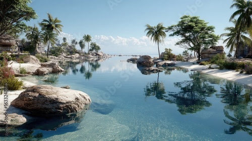 Fototapeta premium Tropical cove with crystal-clear water, palm trees, and rocks