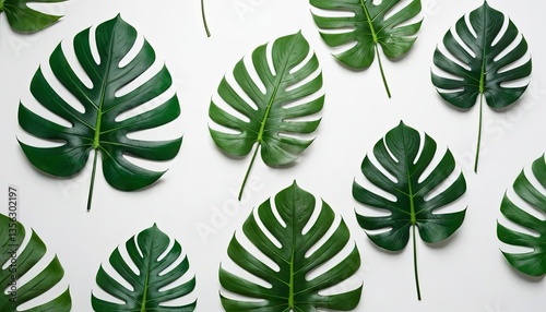 © Designbd25, Fototapeta premium Tropical Elegance: An array of lush, vibrant Monstera leaves is arranged. Emphasizing the natural beauty of this iconic plant and the freshness of nature.