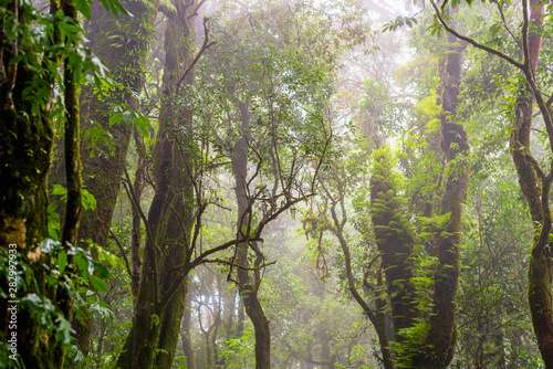 Naklejka premium Tropical evergreen rain forest with morning fog in rainy season.