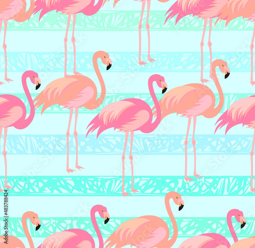 Obraz premium Tropical exotic seamless pattern with pink flamingos. Vector.