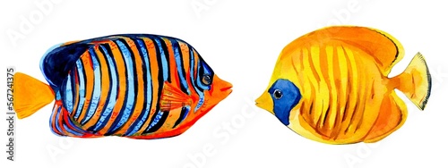 © Tata Pilip, Fototapeta premium Tropical fish on a white background. Bright inhabitants of coral reefs. Chaetodon semilarvatus, Pygoplites diacanthus fish. Watercolor illustration for summer design.