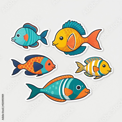 © Alexandra, Naklejka premium Tropical fish sticker on white background. Colorful cartoon set of fish. Generated AI