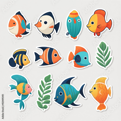 © Alexandra, Fototapeta premium Tropical fish sticker on white background. Colorful cartoon set of fish. Generated AI